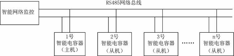 智能集成電容器采用智能網(wǎng)絡(luò)通訊技術(shù),構(gòu)建RS-485通訊網(wǎng)絡(luò),以光電耦合器和獨(dú)立電源組成 RS485通信電路。每臺(tái)智能集成電容器均有各自獨(dú)立的控制器,在多臺(tái)控制器聯(lián)機(jī)工作時(shí),通過通信方式 有機(jī)結(jié)合成一個(gè)整體,能自動(dòng)分配ID地址,自動(dòng)組網(wǎng),其中地址碼小的一臺(tái)為主機(jī),其余為從機(jī)。主機(jī) 將接收所有從機(jī)的信息,依據(jù)無功功率Q、功率因數(shù)入等電力參數(shù),綜合分析判斷后發(fā)出命令,指揮各電力 電容器的投切。當(dāng)主機(jī)故障時(shí)會(huì)自動(dòng)退出,系統(tǒng)重新自動(dòng)組網(wǎng),在其余從機(jī)中產(chǎn)生一臺(tái)新的主機(jī);若從機(jī) 故障時(shí)自動(dòng)退出不會(huì)影響其余從機(jī)的正常工作,避免了常規(guī)補(bǔ)償模式因控制器損壞而致使整個(gè)補(bǔ)償系統(tǒng) 停止工作的狀況,從而保證了補(bǔ)償裝置可靠運(yùn)行。同時(shí)可根據(jù)實(shí)際無功補(bǔ)償容量的需要靈活調(diào)整電容 量,模塊投入與撤出不需設(shè)置,能自動(dòng)更新配置。智能網(wǎng)絡(luò)示意圖如圖3所示。