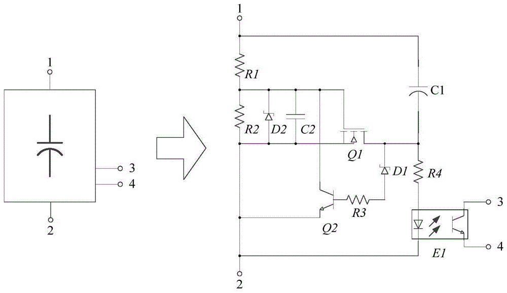 3.根據(jù)權(quán)利要求1所述的智能電容器,其特征在于:所述電容c1為500v/120uf、電阻r4=10kω、電阻r1=200kω、r2=43kω、r3=100kω,c2=10uf、穩(wěn)壓管d1擊穿電壓20v、穩(wěn)壓管d2擊穿電壓12v及場效應(yīng)管q1耐壓500v,導(dǎo)通阻抗50mω。