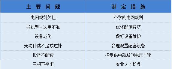 線損是電能傳輸過(guò)程中客觀存在的,是不可避免的,但是在實(shí)際的運(yùn)用當(dāng)中,除了固有的不可改變的電阻、磁抗、電抗等因素外,還存在一些人為技術(shù)上的失誤或技術(shù)上的落后造成的大量線損,而這些是可以通過(guò)技術(shù)手段改進(jìn)的。綜合技術(shù)層面存在的問(wèn)題,結(jié)合最新的電能應(yīng)用發(fā)展以及電能傳輸規(guī)律,也制定了如下技術(shù)措施。