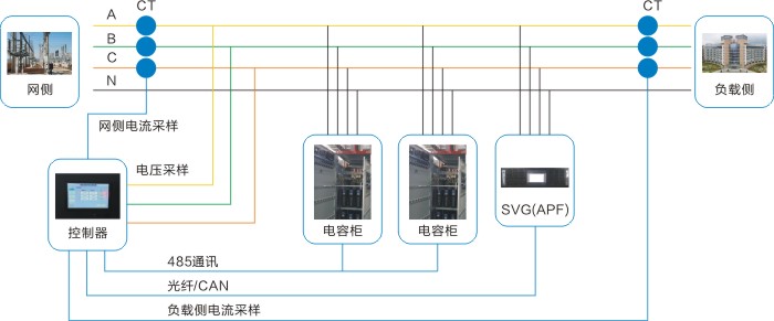 SVGC(APFC)補償系統(tǒng)結(jié)合了動態(tài)補償和濾除諧波功能,對于系統(tǒng)中比較穩(wěn)定的無功需量部分可以通過智能電容器進行靜態(tài)補償;對于系統(tǒng)中變化快的無功需量部分可通過SVG(APF)快速補償,對系統(tǒng)諧波進行主動補償,濾除諧波。該系統(tǒng)既可以滿足用戶無功補償?shù)男枨?,又可以大幅度降低設(shè)備成本。